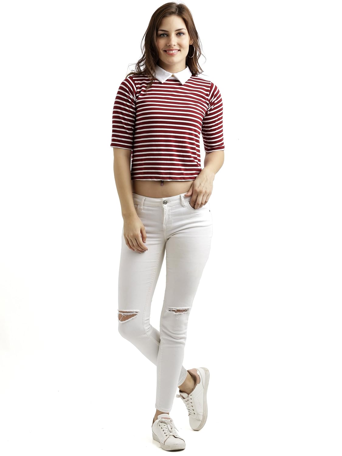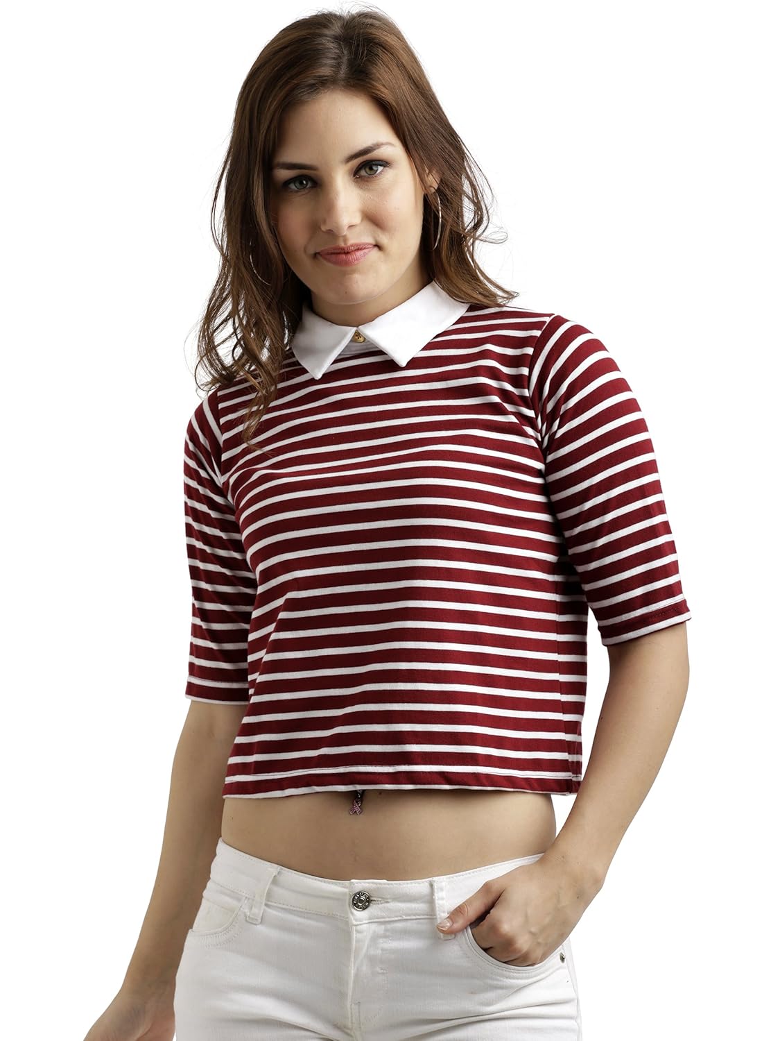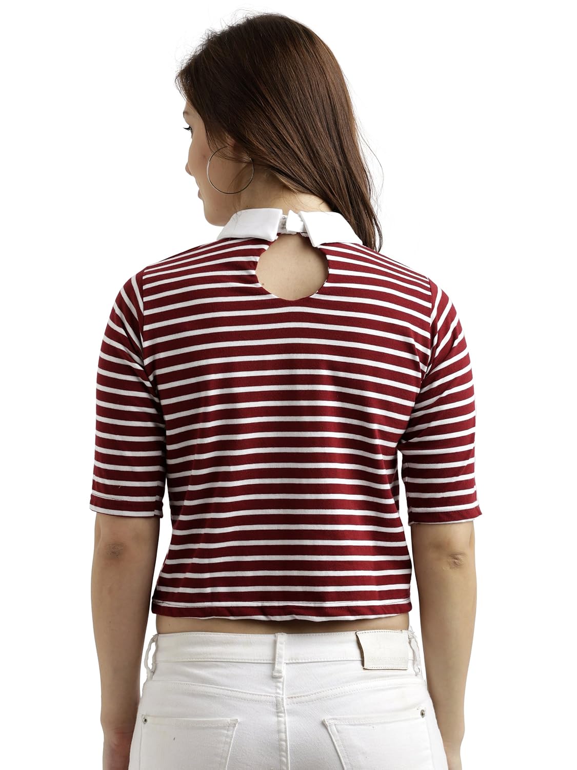 Maroon and White knitted cotton striped collared crop top, Has a round neck and half sleeves, Has a hook closure
