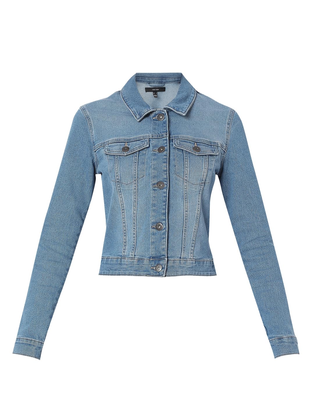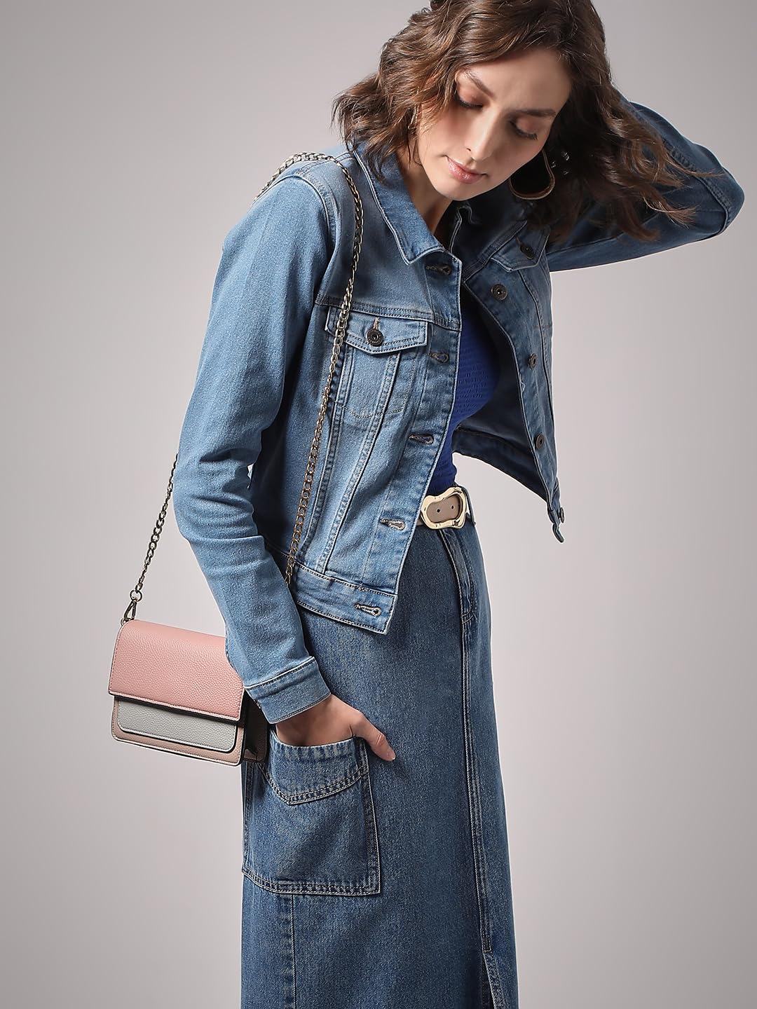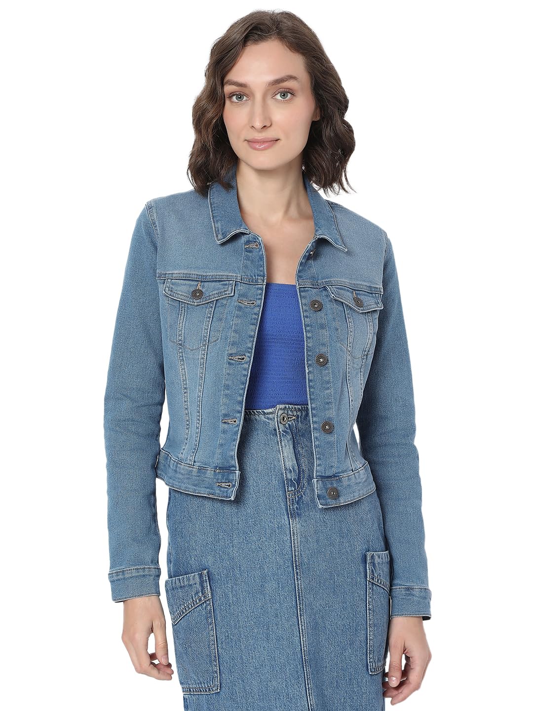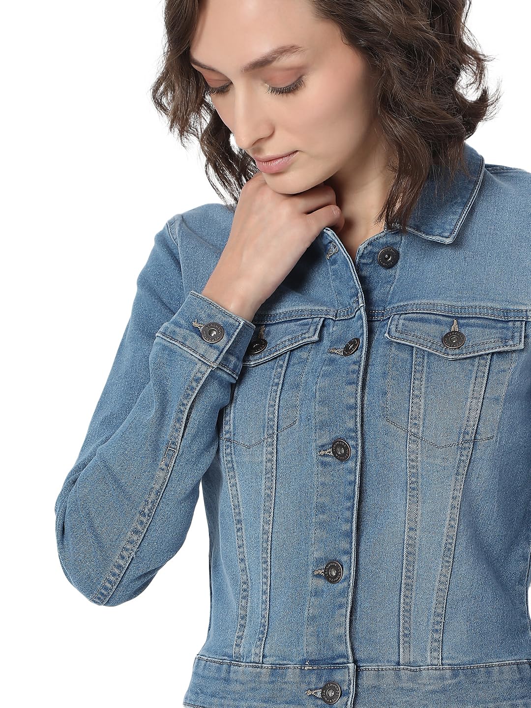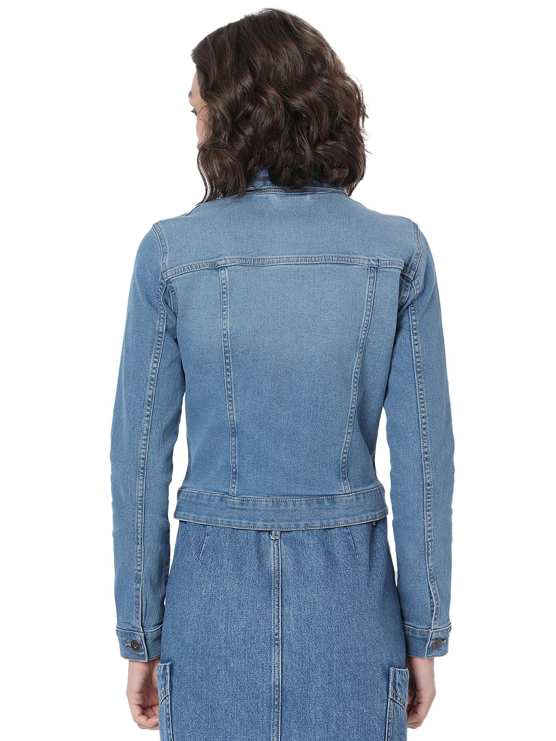 A timeless wardrobe staple, this blue solid denim jacket features a sleek crop length and a classic spread collar. Designed with four functional pockets and a button closure, it offers both style and practicality. The long sleeves and straight hemline complete this effortlessly chic piece, perfect for layering over any outfit.
