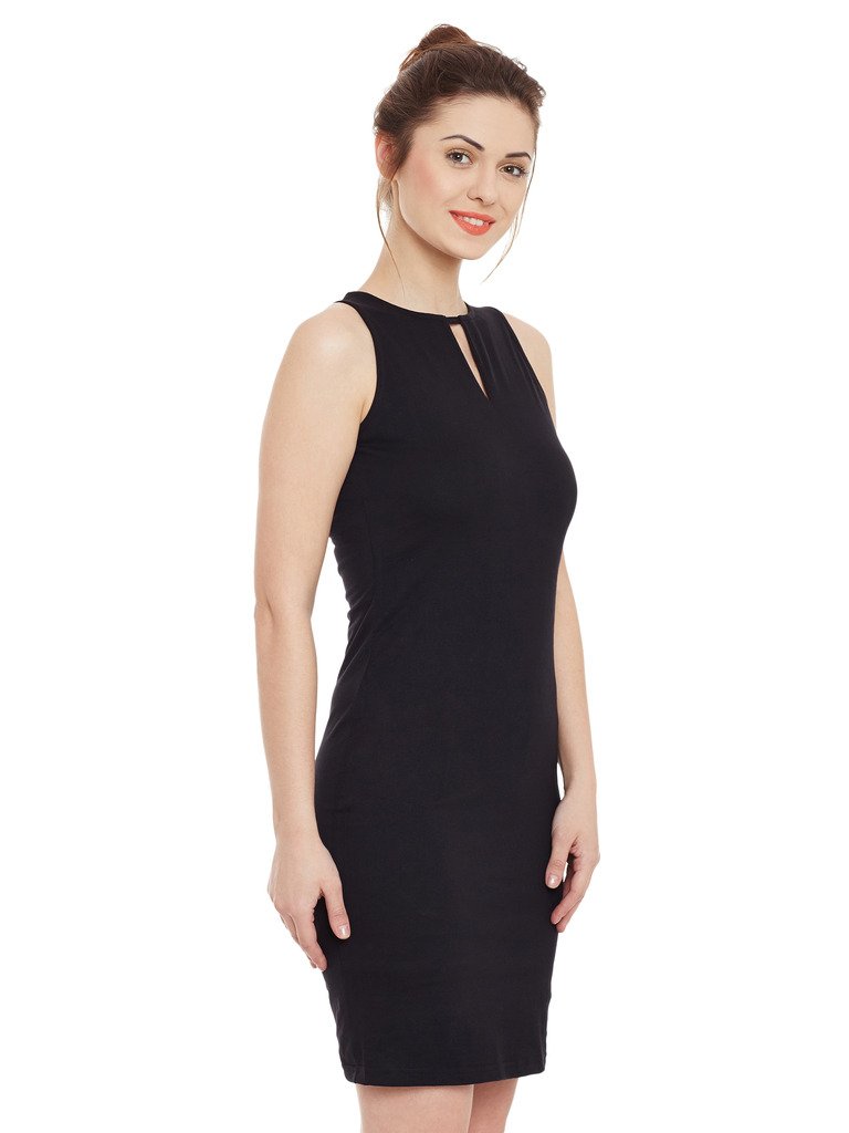 This cotton solid mini bodycon dress, Has a round neck and is sleeveless, Has keyhole detailing and a zipper closure